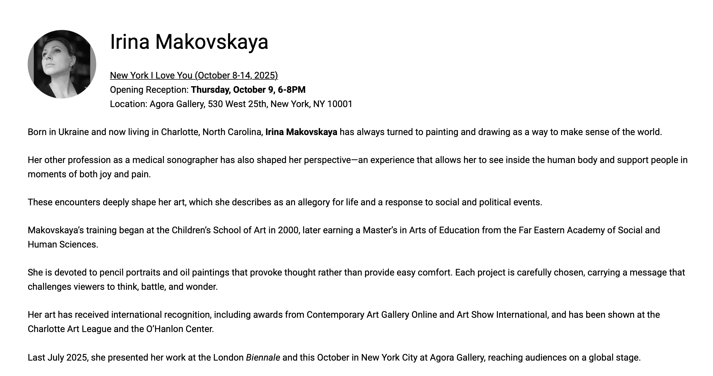 Agora Gallery, New York City, exhibition of “Faces of War” - October 2025